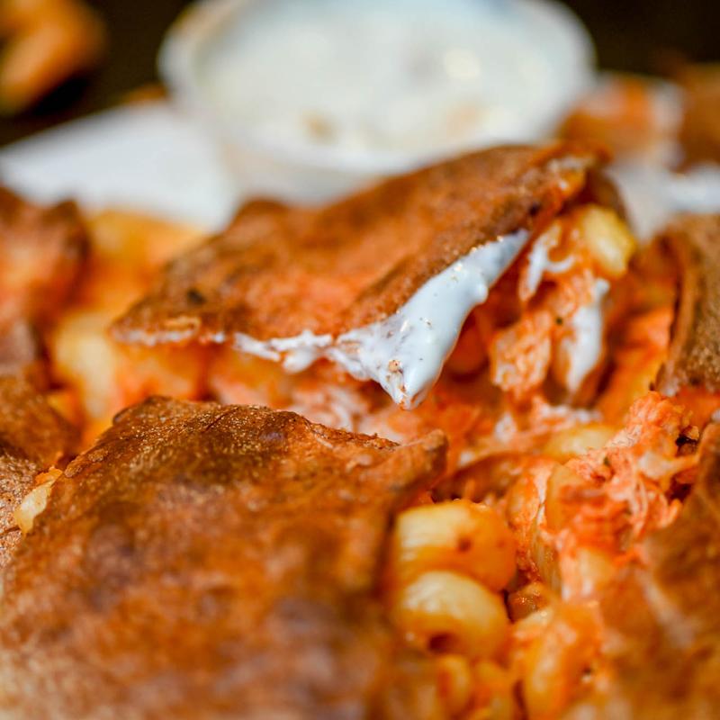 Homemade Buffalo chicken mac & cheese. Served with a side of blue cheese.