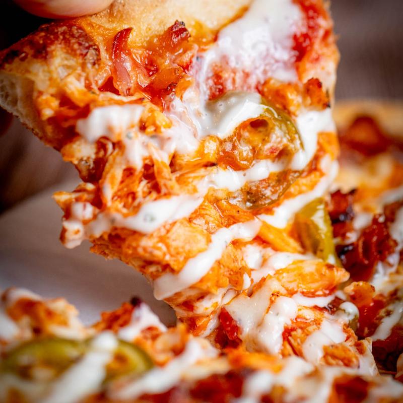 Olive oil base, pizza cheese, buffalo mozzarella, fresh basil, roast chicken, tomato and balsamic drizzle.
