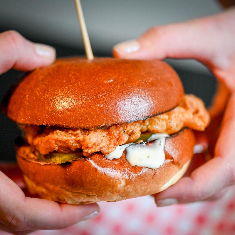 Pickle brined chicken breast breaded per order on a toasty brioche with buttermilk ranch and dill pickles.